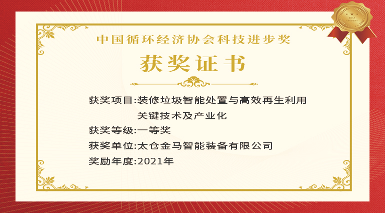 金馬裝備榮獲“中國循環經濟協會科學技術獎一等獎”